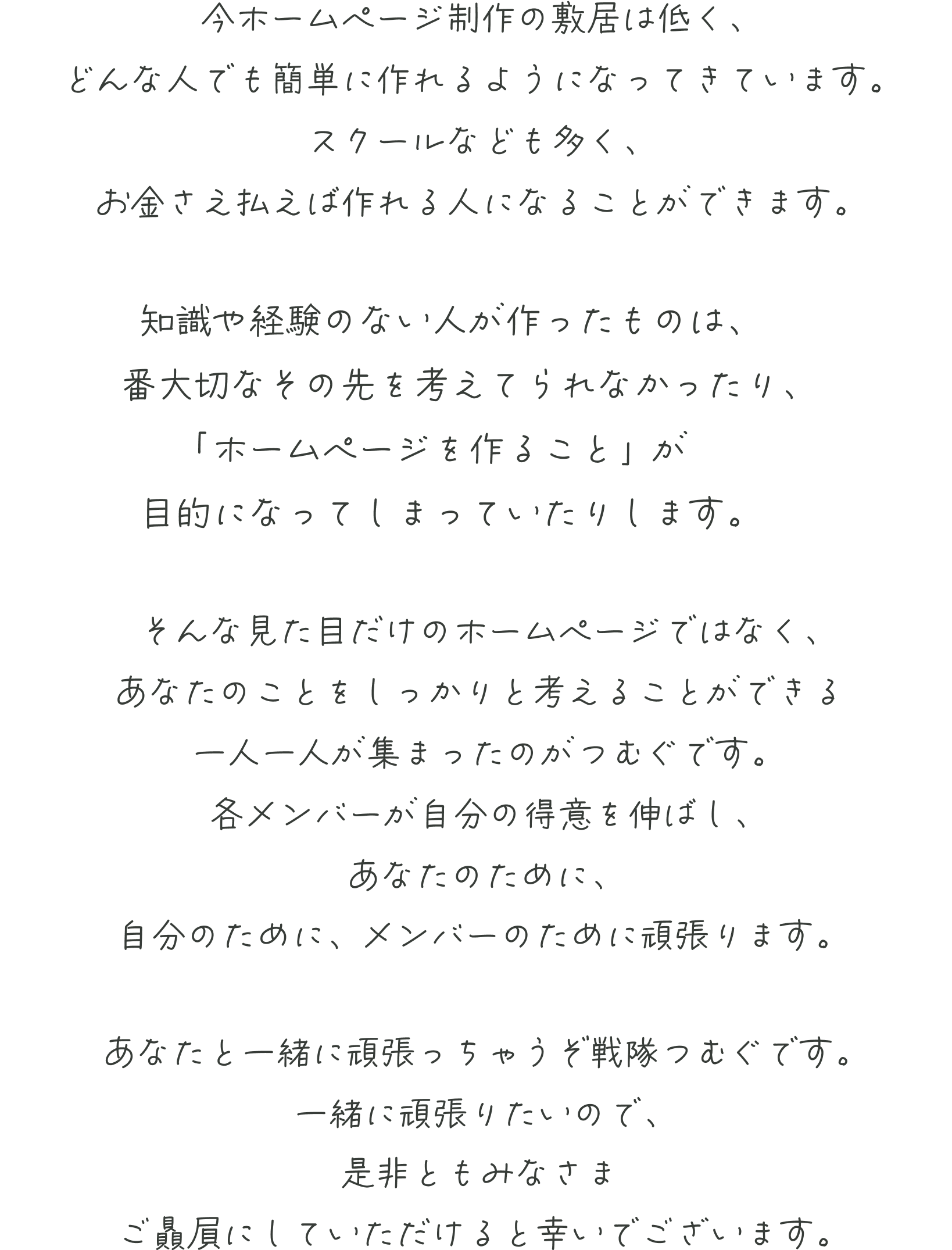 つむぐではWordPressやSTUDIOのテンプレートを使用し、短納期で高クオリティなホームページ制作から、自由度の高い、完全オリジナルのホームページまで幅広いニーズに対応しております。